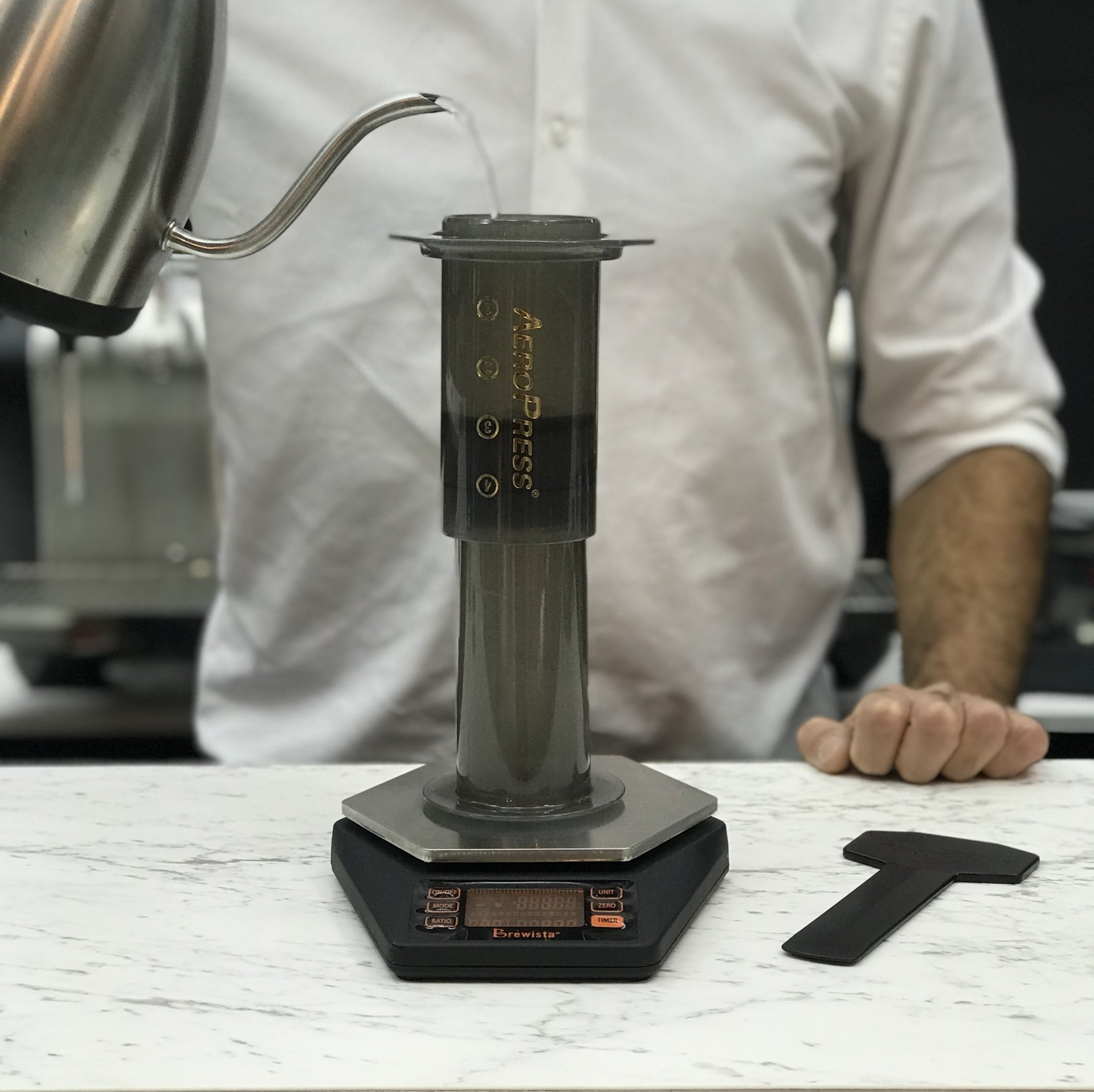 PASO 2: Vierte agua caliente para humedecer el filtro de papel y desecha el agua filtrada. Monta el Aeropress y asegúrate de que está seco